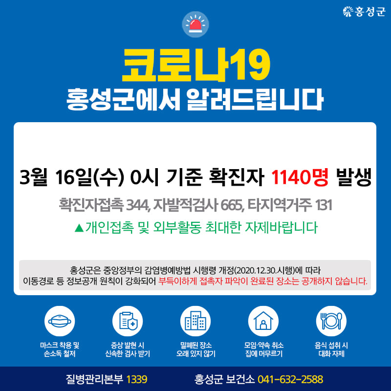 3월 16일(수) 0시 기준 확진자 1140명 발생(확진자접촉 344, 자발적검사 665, 타지역거주 131) 개인접촉 및 외부활동 최대한 자제 Tag #홍성군 #코로나19 #확진자 #발생 저작권자 © 홍주일보 무단전재 및 재배포 금지 홍주일보 다른기사 보기 페이스북 카카오톡 URL복사 기사공유하기