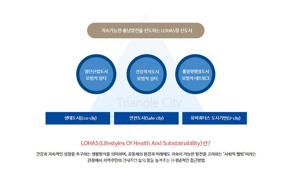 다음은 신도시 개발방향입니다. 충남도 혁신도시정책과는 첨단산업, 통합형 행정, 건강복지 등 3가지 개념을 주요 개발방향으로 소개하고 있습니다. 구체적으로는 도시건설의 기반이 되는 생태도시·안전도시·U-city(첨단 정보통신망을 기본 인프라로 채택한 유비쿼터스 서비스 제공 도시)의 개념을 중심으로 도시계획 기초를 이루면서 지속가능한 충남발전을 선도하는 LOHAS형 신도시를 추구하고 있습니다.