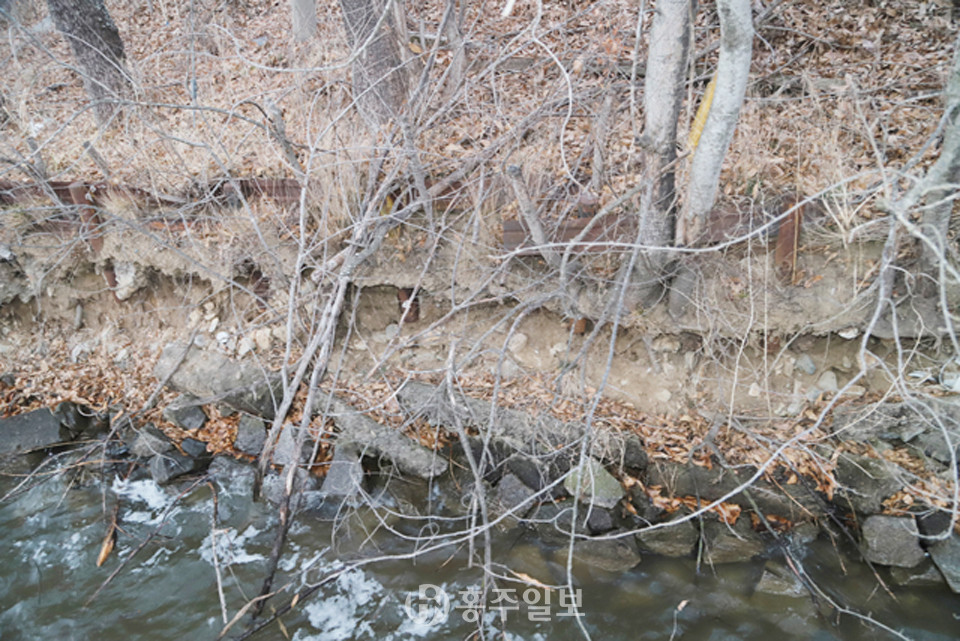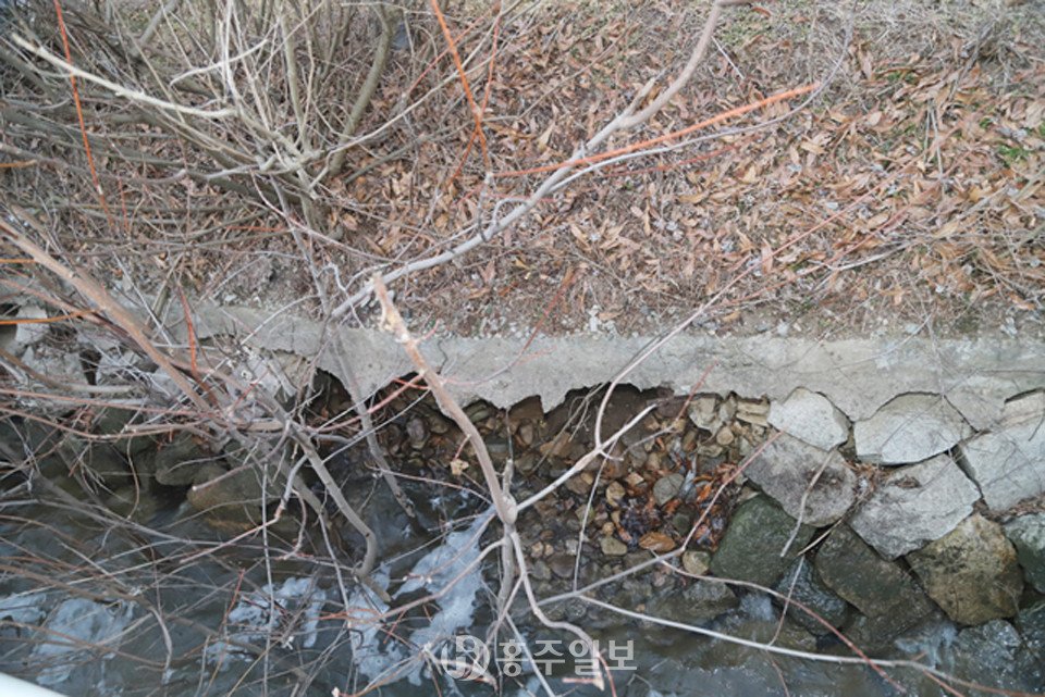 또한 홍양저수지변을 따라 나있는 2차선 도로(홍양길)의 측면은 흙과 나무로 이뤄진 사면이 있고 그 사면의 일부가 축대로 이뤄져 있어 축대가 무너진 지금 사면의 흙이 무너져 내릴 위험성이 우려되고 있다.