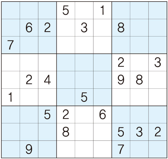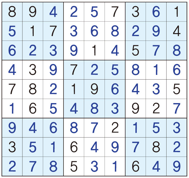 3. 큰 정사각형(9x9) 안에 있는 작은 정사각형(3x3) 안에는 숫자 1~9가 각 한 번씩 들어간다.