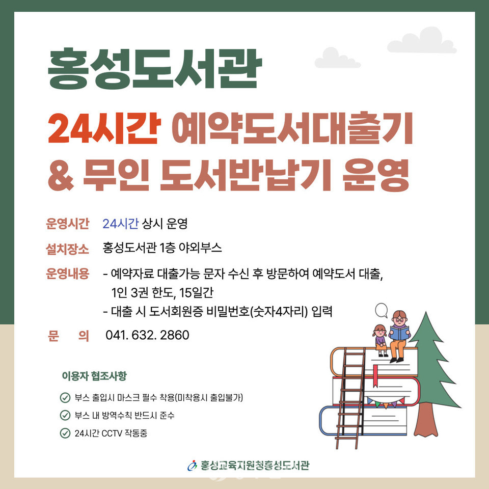 충청남도홍성교육지원청홍성도서관(관장 공진숙)은 도서관 1층 야외부스에 비대면 스마트예약 대출기와 무인도서반납기를 24시간 운영하고 있다.