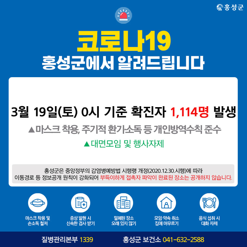 3월 19일(토) 0시 기준 확진자 1114명 발생 대면모임 및 행사 자제 마스크 착용, 주기적 환기·소독 등 개인방역수칙 준수 Tag #홍성군 #코로나19 #확진자 #발생 저작권자 © 홍주일보 무단전재 및 재배포 금지 홍주일보 다른기사 보기 페이스북 카카오톡 URL복사 기사공유하기