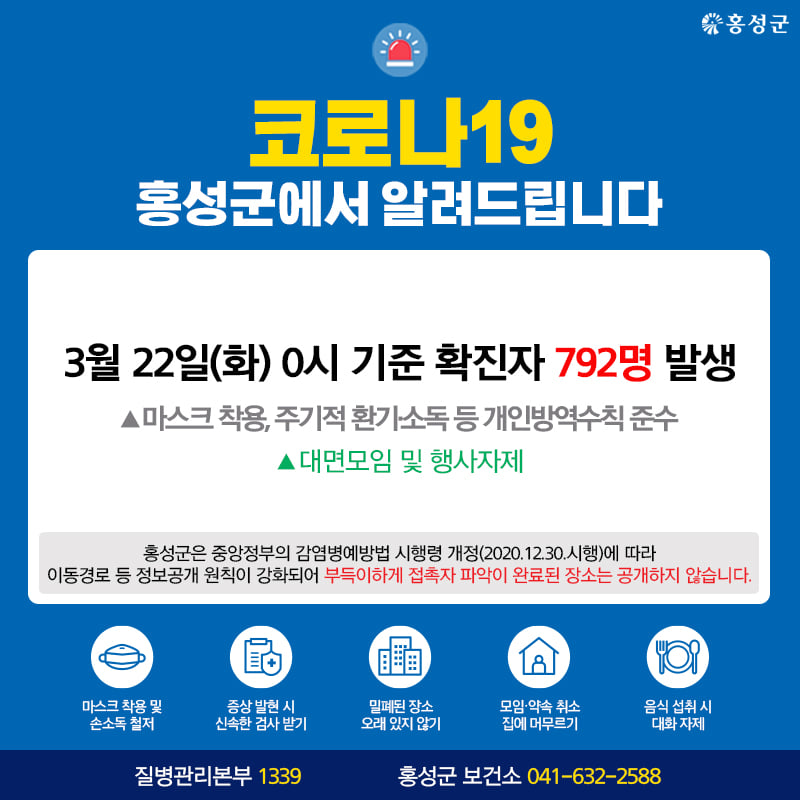 3월 22일(화) 0시 기준 확진자 792명 발생 대면모임 및 행사자제 마스크 착용, 주기적 환기·소독 등 개인방역수칙 준수 Tag #홍성군 #코로나19 #확진자 #발생 저작권자 © 홍주일보 무단전재 및 재배포 금지 홍주일보 다른기사 보기 페이스북 카카오톡 URL복사 기사공유하기