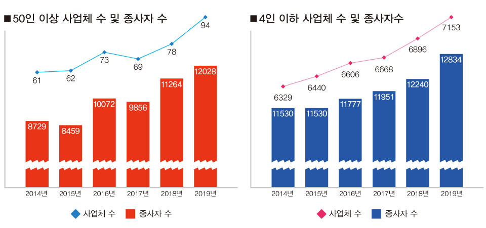 또한 전체 사업체 종사자 중 근로기준법의 일부만 적용받는 4인 이하 영세 사업장에 근무하는 종사자의 비율은 지난 2014년 34.7%에서 2019년 31.4%로 3.3%p 감소했다. 반면 종사자 수 자체는 1만 1530명에서 1만 2834명으로 1304명이 증가했다.