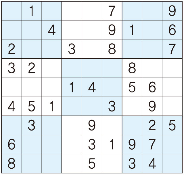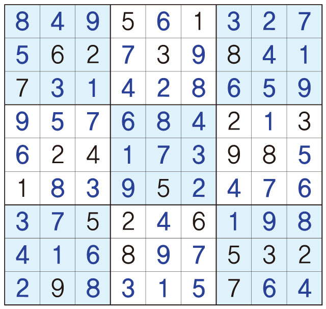 3. 큰 정사각형(9x9) 안에 있는 작은 정사각형(3x3) 안에는 숫자 1~9가 각 한 번씩 들어간다.