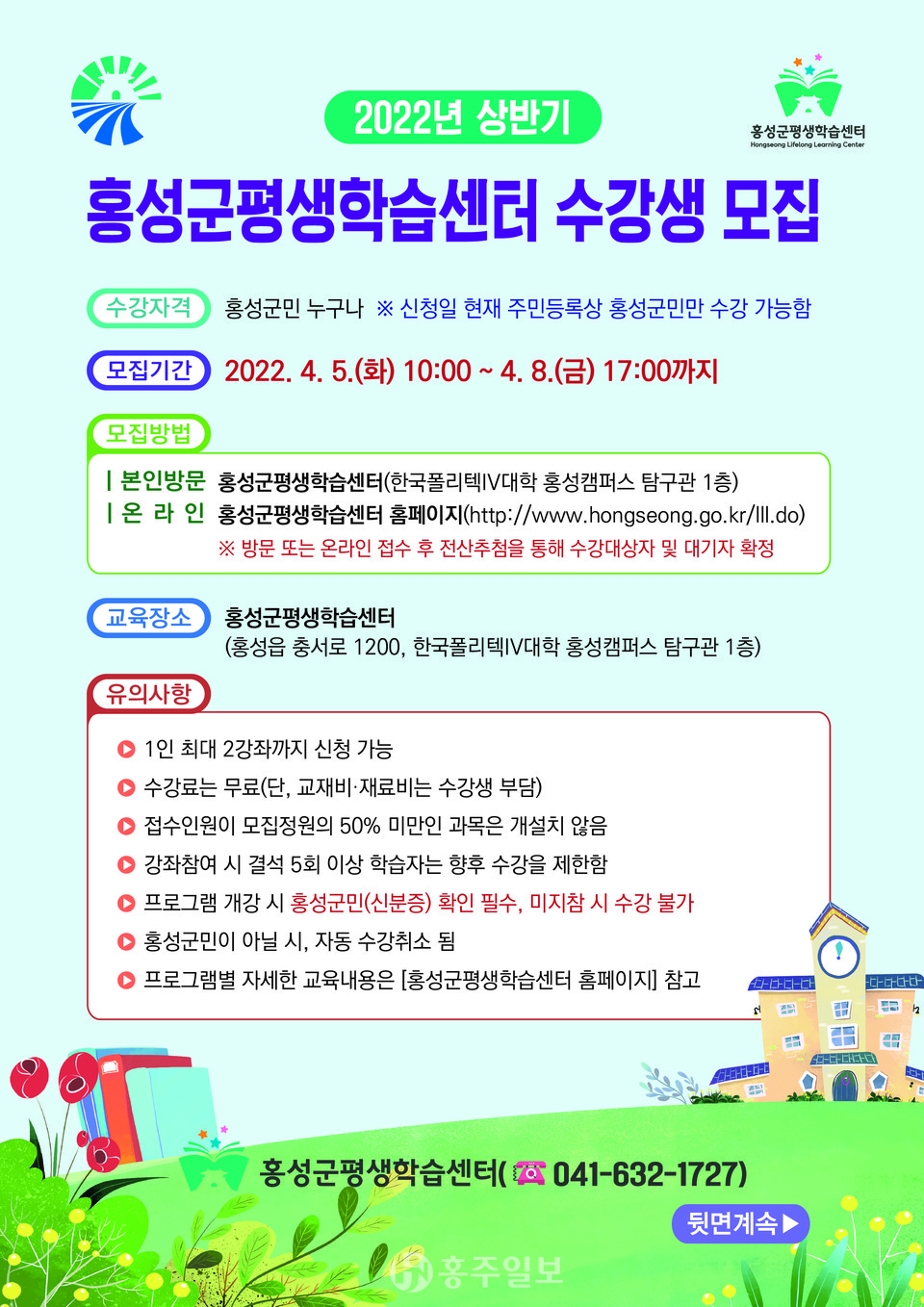 홍성군은 학습을 통한 지식충족과 주민들의 삶의 질 향상을 위한 ‘2022년 상반기 홍성군평생학습센터 프로그램’을 제공하고 다음달 5일부터 8일까지 4일간 수강생을 모집한다.