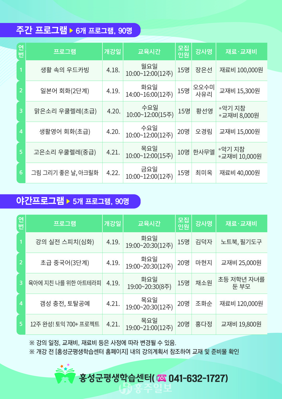 운영 프로그램의 세부 내용은 홍성군평생학습센터 홈페이지에서 확인 가능하며, 기타 문의사항은 홍성군평생학습센터(041-632-1727)로 문의하면 된다.