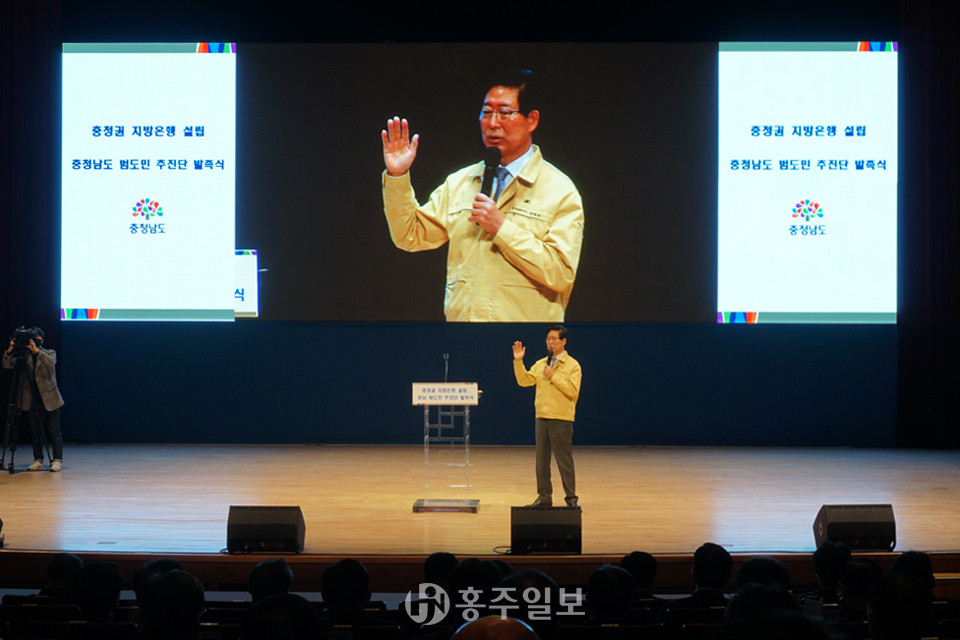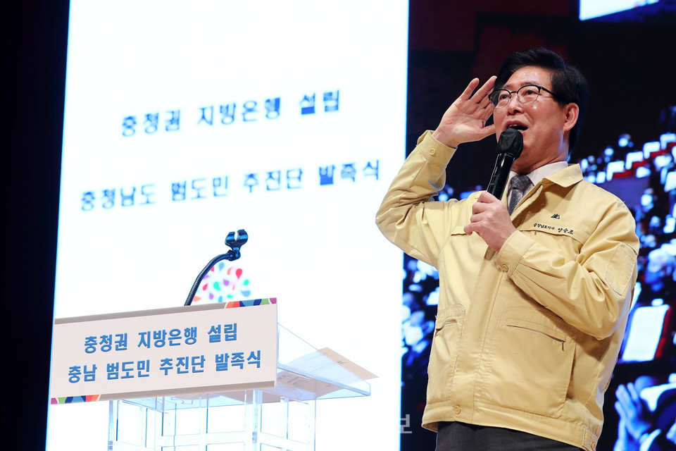 충청권 메가시티 완성과 지역 균형발전의 핵심 역할을 하게 될 ‘충청권 지방은행’ 설립을 위해 충남도는 지난 25일 도청 문예회관에서 양승조 지사와 김명선 도의장, 김지철 도교육감, 지역 국회의원, 시장·군수, 각계 기관·단체 대표 등이 참석한 가운데, ‘충청권 지방은행 설립 충남 범도민추진단 발족식’을 개최했다.