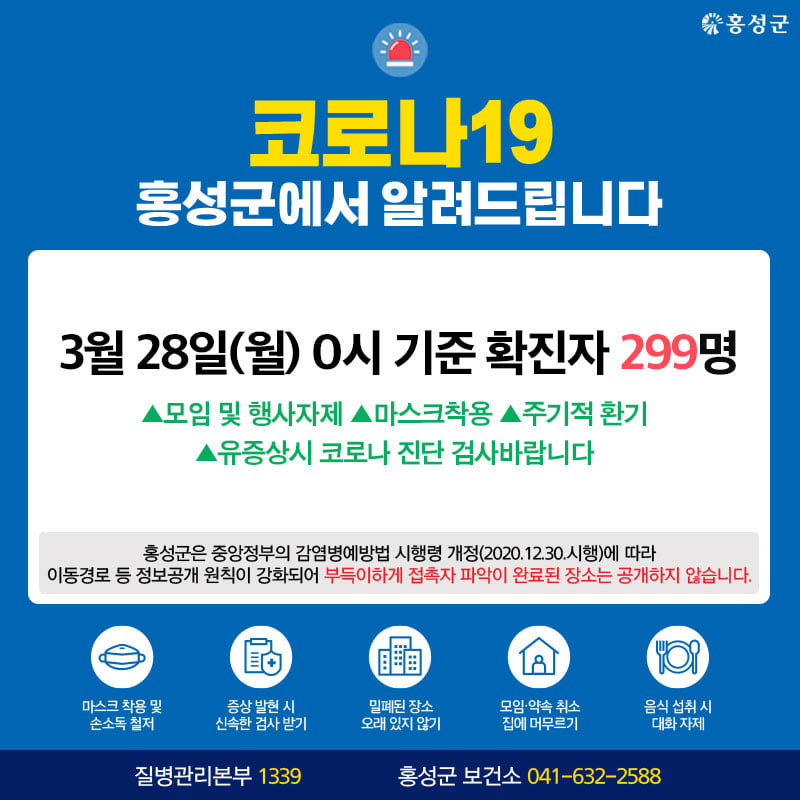 3월 28일(월) 0시 기준 확진자 299명 발생 모임 및 행사 자제, 마스크 착용, 주기적 환기, 유증상 시 코로나 진단 검사바랍니다. Tag #홍성군 #코로나19 #확진자 #발생 저작권자 © 홍주일보 무단전재 및 재배포 금지 홍주일보 다른기사 보기 페이스북 카카오톡 URL복사 기사공유하기