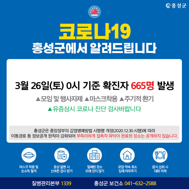 3월 26일(토) 0시 기준 확진자 665명(누적19,285) 발생 모임 및 행사 자제, 마스크 착용, 주기적 환기, 유증상 시 코로나 진단 검사바랍니다. Tag #홍성군 #코로나19 #확진자 #발생 저작권자 © 홍주일보 무단전재 및 재배포 금지 홍주일보 다른기사 보기 페이스북 카카오톡 URL복사 기사공유하기