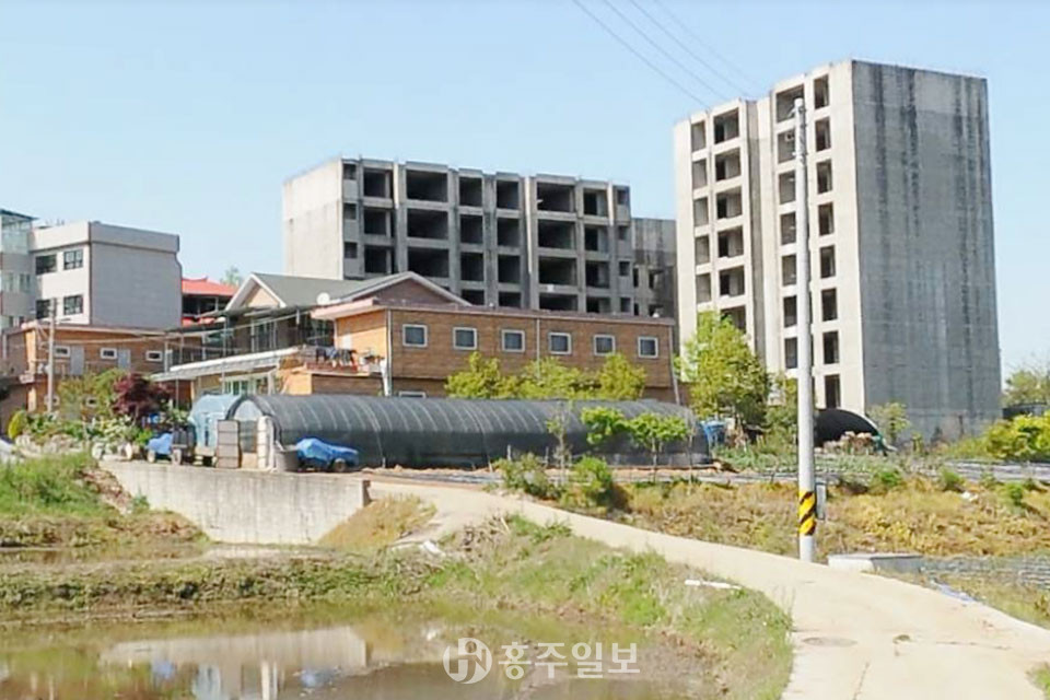 세 번째, 지역 정착 청년과 신혼부부에게 주택을 제공하는 것이다. 홍성에는 지금 유휴 건물들이 종종 있다. 예를 들면 남산에 건축하다 멈춰져 있는 주택<사진>을 매입 재건축해 제공한다든지 혜전대학촌을 개발해 청년주택으로 제공하는 방법이다.
