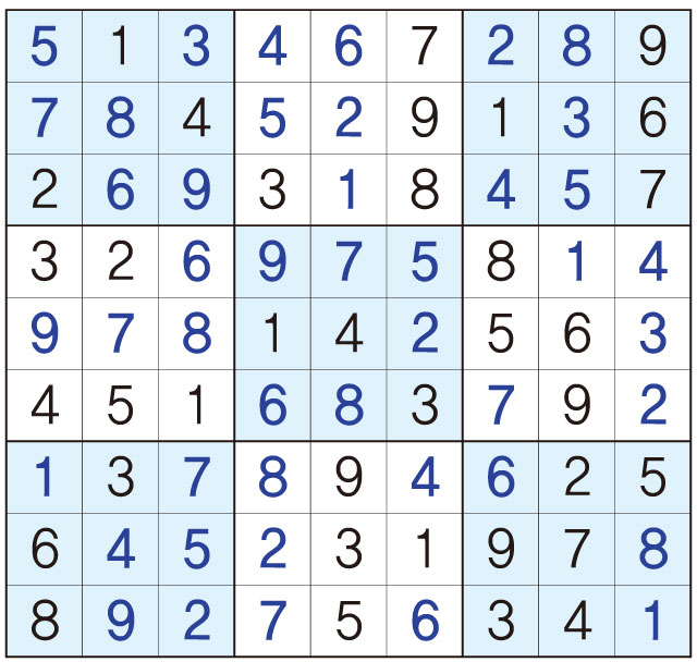 3. 큰 정사각형(9x9) 안에 있는 작은 정사각형(3x3) 안에는 숫자 1~9가 각 한 번씩 들어간다.