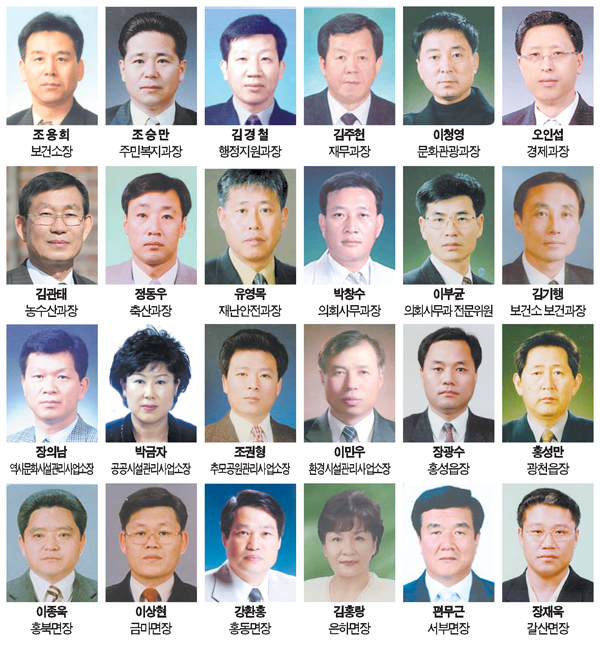 아울러 홍성읍을 비롯한 8개 읍·면장의 인사도 대폭 단행됐다. △홍성읍장 장광수 △광천읍장 홍성만 △홍북면장 이종욱 △금마면장 이상현 △홍동면장 강환홍 △은하면장 김홍랑 △서부면장 편무근 △갈산면장에 장재욱 사무관 등이 전보 또는 승진 발령됐다. 이철규 전 홍성읍장은 정년퇴임을 앞두고 공로연수에 들어갔다.