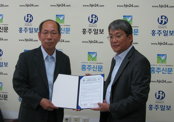 한국농어촌공사 천수만사업단(단장 서안철·사진 오른쪽)과 홍주일보 홍주신문(대표 한관우·사진 왼쪽)은 지난달 28일 상호이해와 신뢰를 바탕으로 교류협력을 추진하면서 홍성지역사회발전을 공동수행하기 위한 업무협약을 맺었다.