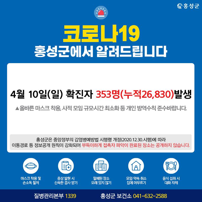4월 10일(일) 확진자 353명 발생 올바른 마스크 착용, 사적 모임 규모·시간 최소화 등 개인 방역수칙 준수바랍니다. 저작권자 © 홍주일보 무단전재 및 재배포 금지 홍주일보 다른기사 보기 페이스북 카카오톡 URL복사 기사공유하기