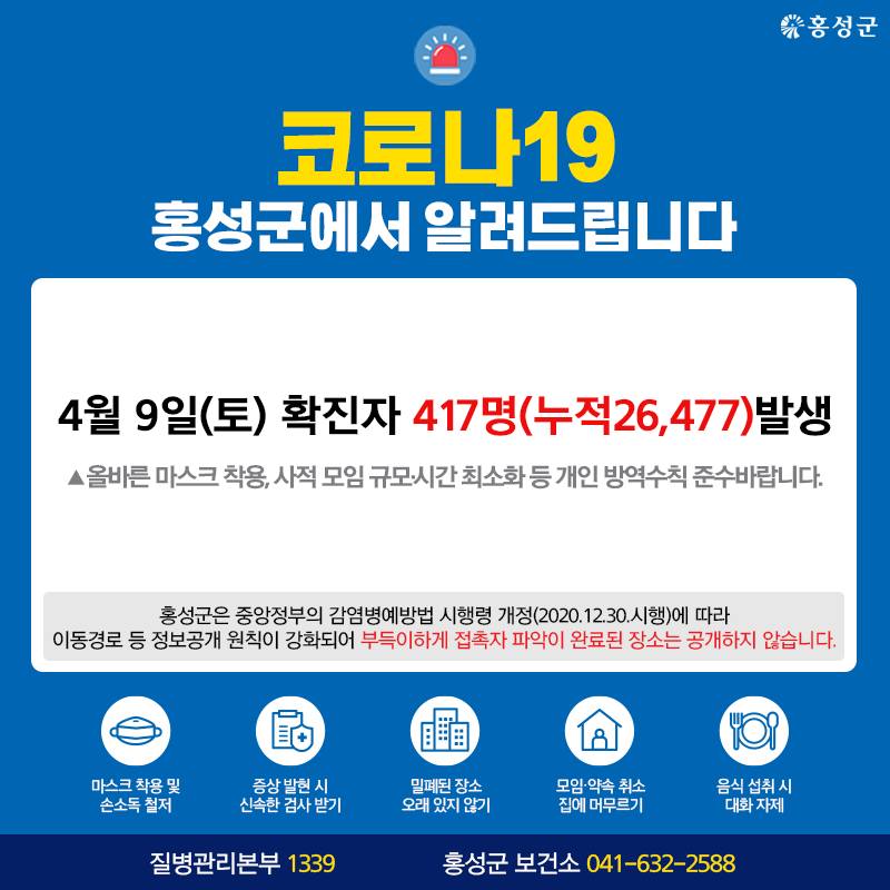4월 9일(토) 확진자 417명 발생 4.11부터 보건소신속항원검사 중단 올바른 마스크 착용, 사적 모임 규모·시간 최소화 등 개인 방역수칙 준수바랍니다. Tag #홍성군 #코로나19 #확진자 #발생 저작권자 © 홍주일보 무단전재 및 재배포 금지 홍주일보 다른기사 보기 페이스북 카카오톡 URL복사 기사공유하기