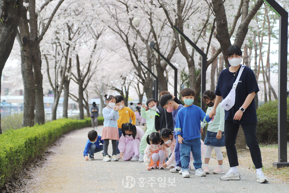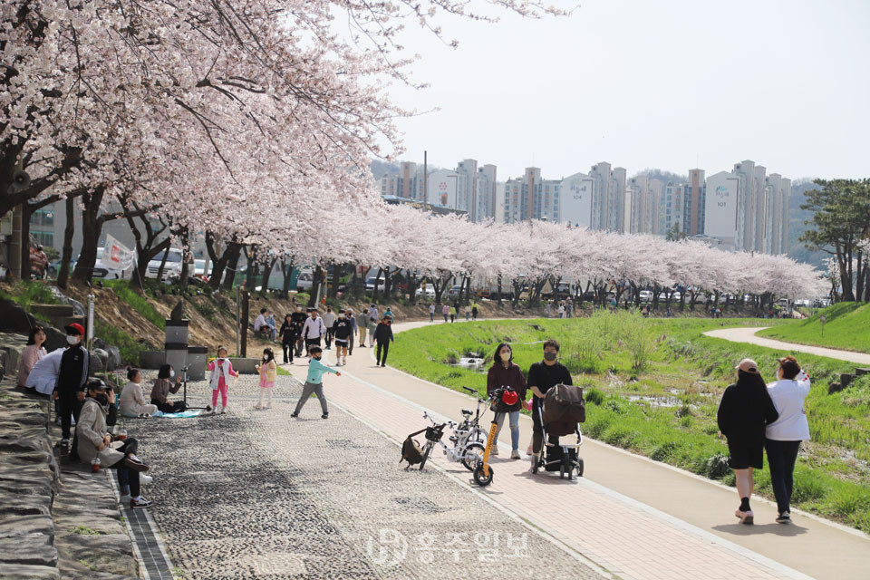봄을 맞아 홍성군 전역에 이름 모를 들꽃부터 수선화까지 봄꽃들이 활짝 폈다. 지난 주말에는 벚꽃이 만개해 거북이마을 벚꽃가로수길, 홍성천변길 벚꽃, 부영아파트 앞 월계천길 벚꽃, 대교공원 벚꽃길 등 홍성의 벚꽃 명소에는 흐드러지게 핀 꽃의 물결을 구경하러 외출 나온 주민들로 붐볐다.