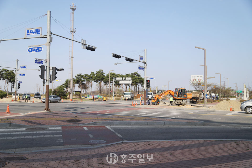지난 12일 교통량이 많은 낮 시간에 충남대로의 차선까지 통제하며 공사를 진행하고 있는 모습. 내포신도시 주민들이 나들목사거리의 154kV 송전선로 공사로 인해 교통에 많은 불편을 겪었다.