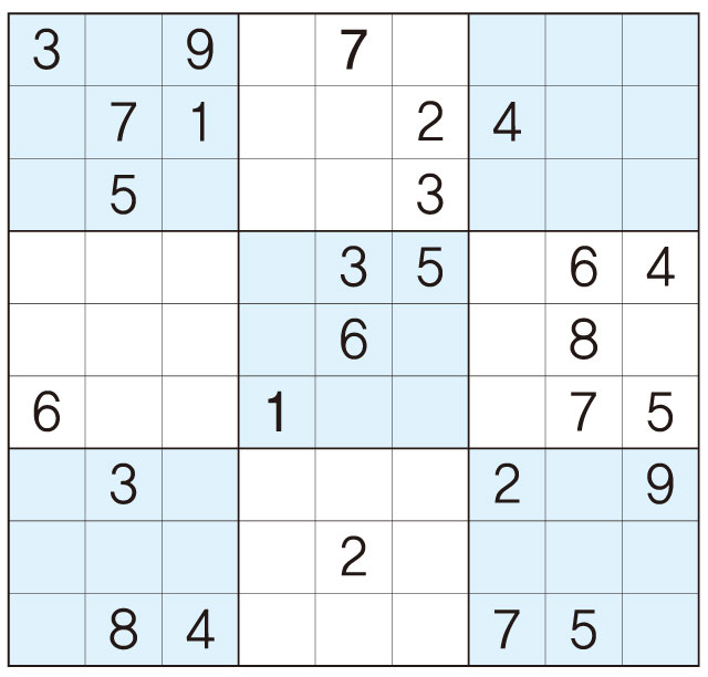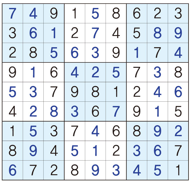 3. 큰 정사각형(9x9) 안에 있는 작은 정사각형(3x3) 안에는 숫자 1~9가 각 한 번씩 들어간다.