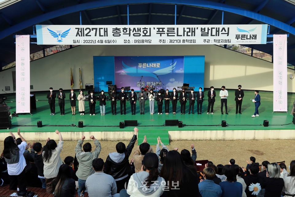 청운대학교 총학생회(학생회장 전세웅)는 지난 6일 청운대 야외음악당에서 이우종 총장과 교무위원, 재학생, 신입생들이 참석한 가운데 제27대 총학생회 ‘푸른나래’ 발대식을 개최했다.<사진>
