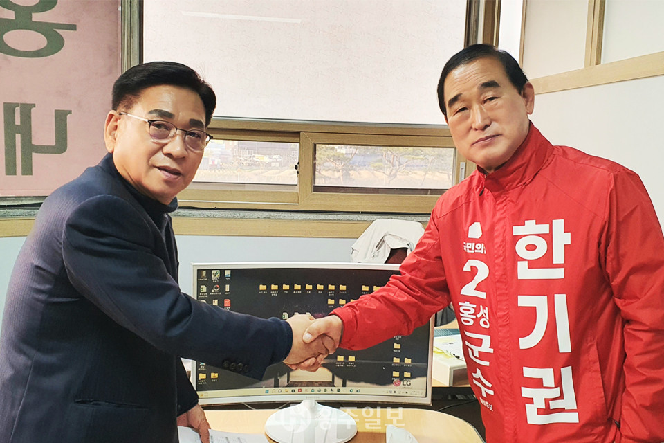 홍성군수 경선을 앞두고 국민의힘 한기권 예비후보와 채현병 예비후보가 지난 17일 단일화를 이뤄냈다.