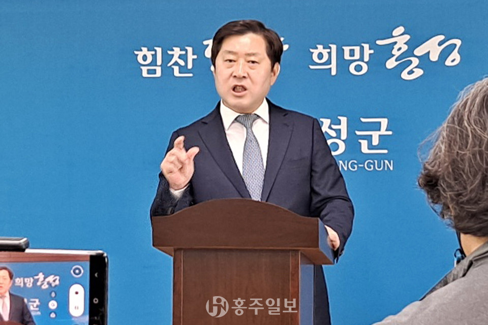 황명선 충남도지사 예비후보가 19일 홍성군을 찾아 군청 행정홍보지원실에서 기자간담회를 가졌다.<사진>