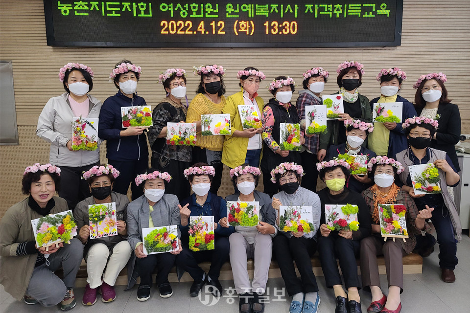 홍성군 농촌지도자회가 지난 12일 농촌지도자회 여성회원을 대상으로 진행한 원예교육복지사 양성과정 수료식을 갖고 20명의 원예교육복지사를 배출했다.<사진> 이번 양성과정은 여성농업인의 농외소득 창출 등 농촌지도자회 단체 활력에 도움을 주고자 실시됐다.