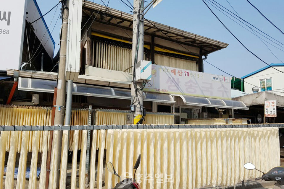 한편 1952년 예산읍에서 두 번째로 지어졌다는 일본식 2층 목조건물에서 3대를 이어 제면소를 운영하고 있는 ‘쌍송국수’는 김민균 사장(40)이 70년의 가업을 잇고 있다. 이 집은 예산에 단 두 채밖에 없을 정도로 유명했는데 아직도 옛날 모습 그대로 원형을 간직하고 있다. 70여 년의 역사를 자랑하며 지역의 명소로 자리매김했던 예산시장통의 명물로 통했다. 요즘은 쉽게 찾아볼 수 없는 제면소의 풍경은 그 자체만으로도 이색적인 볼거리다. 국수를 햇빛과 바람으로만 건조해 ‘태양국수’라고도 부르는 건면을 전통방식대로 만든다. 쌍송국수는 한국전쟁이 일어나기 전부터 가내수공업 형태로 시작해 70여 년 3대를 이으며 추억과 정성이 온전히 담긴 맛이다. 비록 집이 낡고 비좁아 3년 전 새 보금자리(예산읍 천변로 159)로 옮겼다.