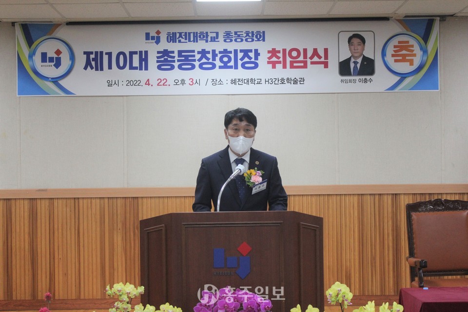 이어진 격려사에서 이혜숙 혜전대학교 총장은 “오늘 취임하신 이충수 회장님을 중심으로 그동안 역대 총동창회장님들이 쌓아 온 훌륭한 업적을 계승하고, 동문 간의 화합과 단결을 통해 총동창회를 더욱 활성화해주시기 바란다”고 전했다.