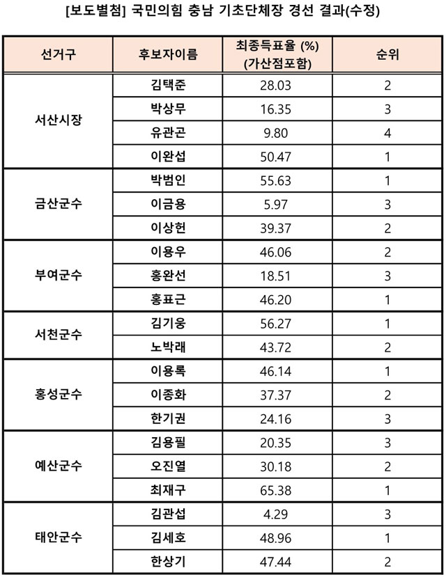 발표에 따르면 △서산시 이완섭 후보(50.47%) △금산군 박범인 후보(55.63%) △부여군 홍표근 후보(46.20%) △서천군 김기웅 후보(56.27%) △홍성군 이용록 후보(46.14%) △예산군 최재구 후보(65.38%) △태안군 김세호 후보(48.96%) 등이 확정됐다.
