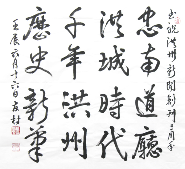서예가 우촌 박상현 박사(전 재경금마면민회 회장)가 증정한 홍주신문 창간축하 휘호. ‘忠南道廳 洪城時代 千年洪州 歷史新筆(충남도청 홍성시대, 천년홍주 역사신필: 충남도청 홍성시대를 맞아 천년 홍주의 역사를 새롭게 쓴다)’