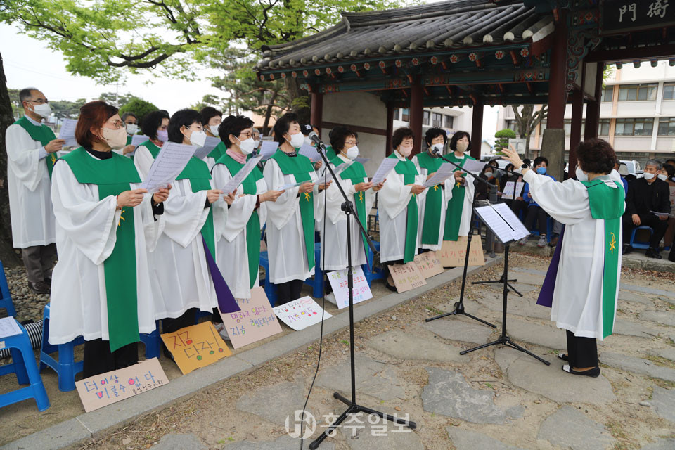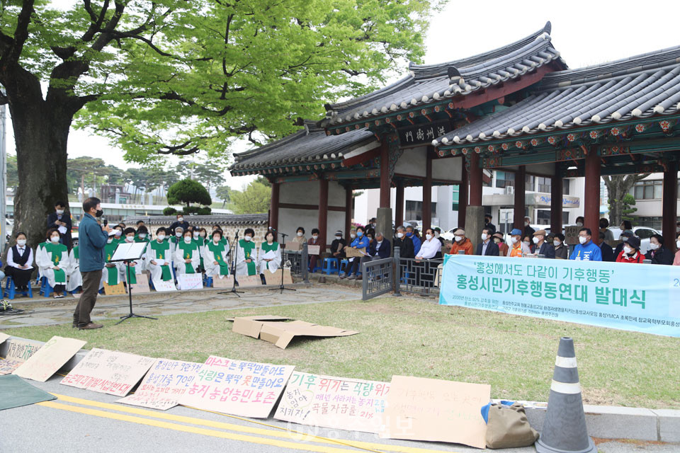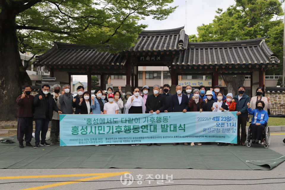 지난 23일 홍성군청 앞에서 홍성시민기후행동연대(공동대표 목사 정창석·신부 임기선·교무 김현정, 이하 기후연대)가 발대식을 가졌다.<사진>