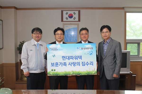 지난 4일 현대파워텍(주)(대표이사 배인규)은 홍성보훈지청(지청장 이종경)을 방문하고 보훈가족을 위한 사랑의 집수리 사업성금 500만원을 기탁했다. 기탁된 성금은 도서지역에 있는 주거환경이 열악한 보훈가족 주택수리 자금으로 사용될 예정이다. 이 자리에서 참석한 김성환 이사는 “우리나라 현재의 모습은 국가유공자들의 희생과 공헌이 초석이 되어 이루어졌기에, 국가유공자들의 어려움을 돌아보는 것은 우리 국민의 의무라면서, 향후 보훈가족을 위한 사랑의 집수리사업을 지속적으로 펼치겠다”고 전했다. 김혜동 기자