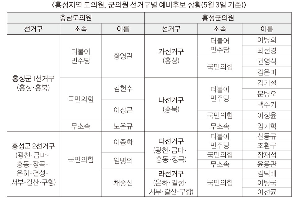 홍성군의원 다선거구(광천·금마·홍동·장곡)에서는 민주당에서 신동규 예비후보와 조환구 예비후보가 경선을 벌여 1명만 추천될 예정이다. 국민의힘에서는 장재석 예비후보가 등록했고 기존에 등록했던 신경진 예비후보는 사퇴할 뜻을 밝혔다. 또한 무소속 윤용관 군의원이 지난 3일 예비후보를 등록했다.
