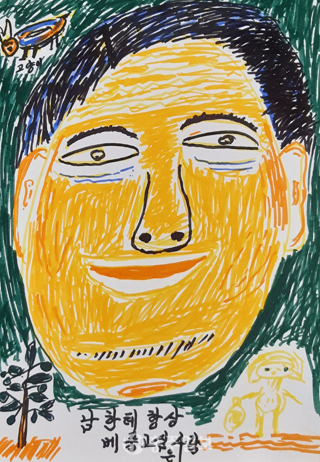 장문혁 어르신의 자화상은 얼굴의 노랑색과 흰 바탕에 칠한 초록색이 아름답게 어울리고 있습니다. 실제얼굴과 닮게 그리기 보다는 형태와 채색을 자유롭게 하여 보는 사람의 마음도 자유로워집니다. 얼굴 외의 남은 공간에는 사람과 나무와 고양이를 그려 넣었습니다. 이들 또한 장문혁 어르신을 나타내고 이해하는 단서들이며 보는 이에게 여러 가지 이야기를 전해줍니다.