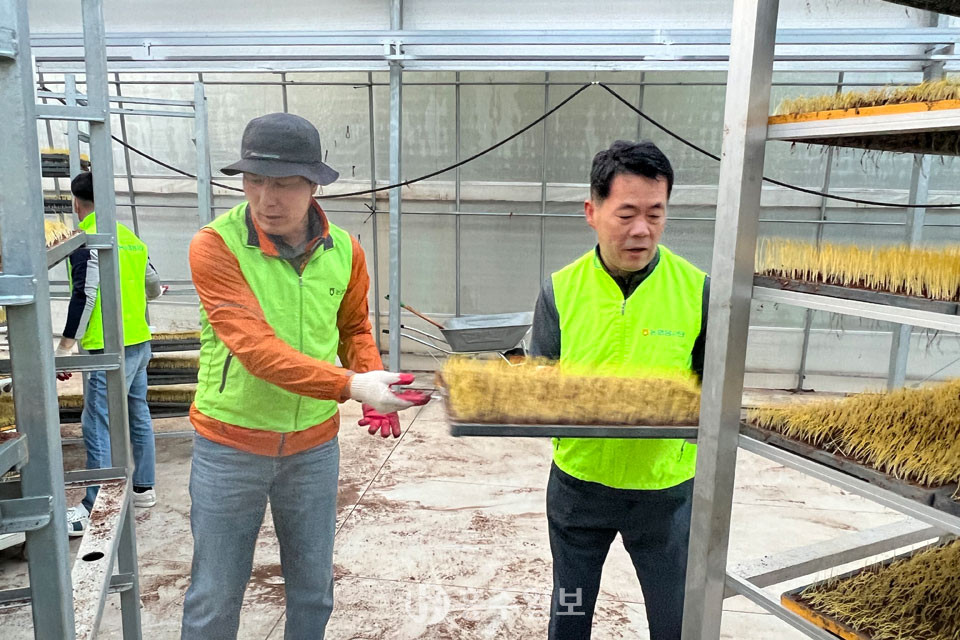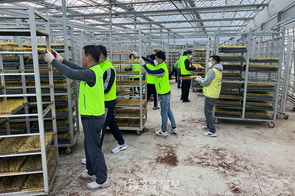 NH농협 홍성군지부(지부장 한만철)는 지난 2일 본격적인 농번기를 맞아 일손이 부족한 장곡농업협동조합(조합장 김준호) 벼 육묘장을 찾아 일손돕기 시간을 가졌다.<사진>