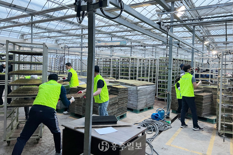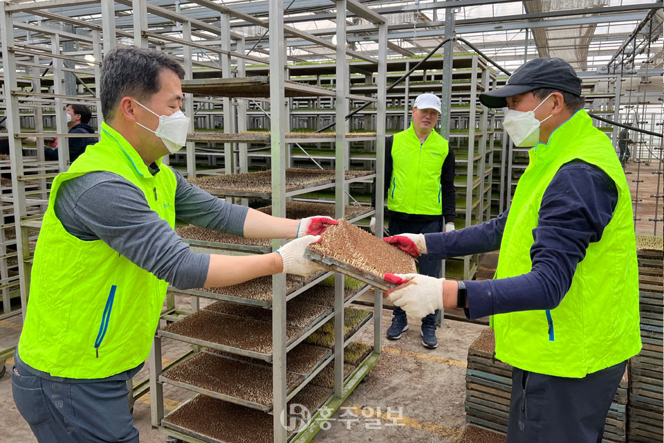 NH농협 홍성군지부(지부장 한만철)는 10일 본격적인 농번기를 맞아 서부면 광리에 위치한 서부농업협동조합(조합장 표경덕)이 운영하는 벼 육묘장을 찾아 농촌 일손돕기 시간을 가졌다.<사진>