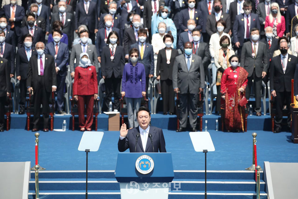 윤 대통령은 지난 10일 서울 여의도 국회의사당 앞에서 제20대 대한민국 대통령에 취임했다. 윤 대통령은 “자신은 대한민국을 자유민주주의와 시장경제체제를 기반으로 한 국민이 진정한 주인인 나라로 재건하고, 국제사회에서 책임과 역할을 다하는 나라로 만들어야 하는 시대적 소명을 가지고 오늘 이 자리에 섰다”라고 말문을 열었다.
