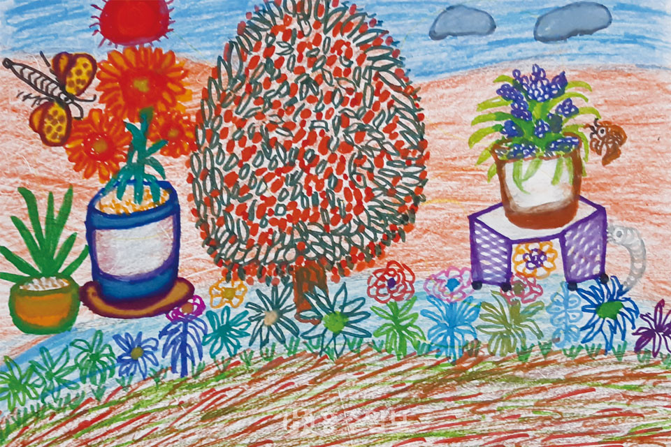 이 태화 어르신은 꽃밭을 그려오셨습니다. 지금까지 그리신 것과는 다르게 색채가 화려하고 산뜻합니다. 언뜻 보기에도 꽃이 참 다양하다는 것을 알 수 있었습니다. 붉은 담장과 연두색 넝쿨의 조화도 아름다웠습니다. ‘이 그림 따님에게 보이셨어요?’ 사진을 찍어서 보이셨다고 하십니다. 이 태화 어르신은 그림을 완성할 때마다 사진을 찍어 따님에게 보인다고 하십니다. 따님의 격려와 응원이 힘이 되고 나아갈 방향을 알게 된다고 하십니다.