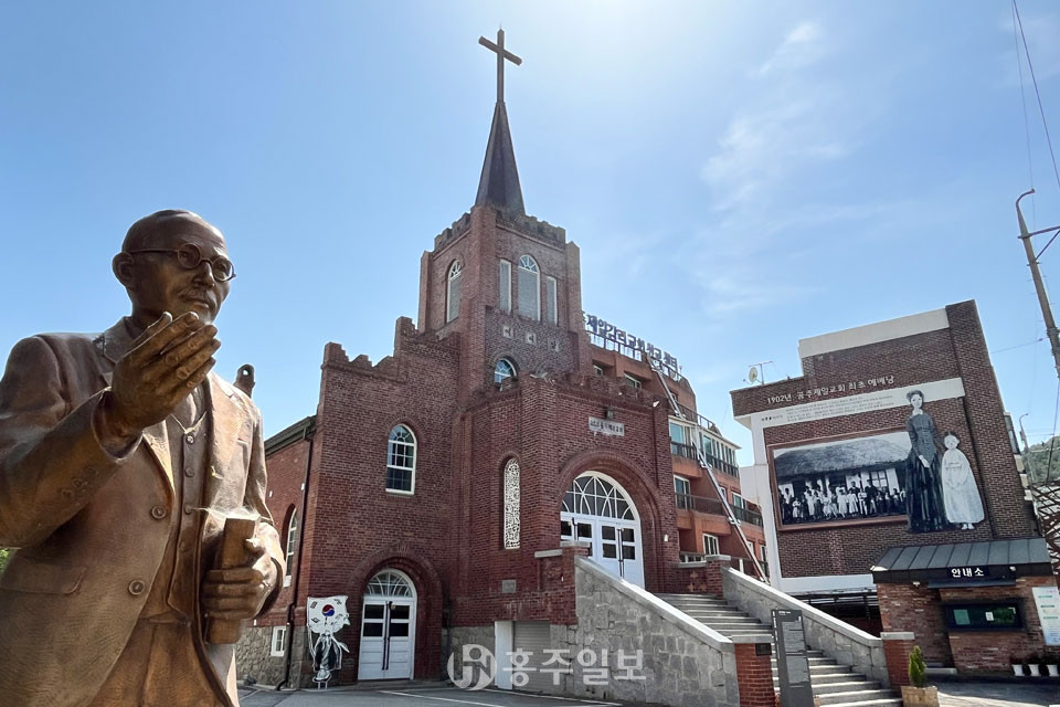 영명학교에서 충남역사박물관 방면 언덕 위에는 웅장한 성당이 보인다. 충청도 서해안을 통해 들어온 천주교가 내륙으로 들어오면서 지어진 대표적인 성당이다. 1898년 프랑스 진 베드로 신부가 이곳에 교당을 세우고 교리 전파를 시작하면서 공주에 천주교가 자리 잡게 됐다.