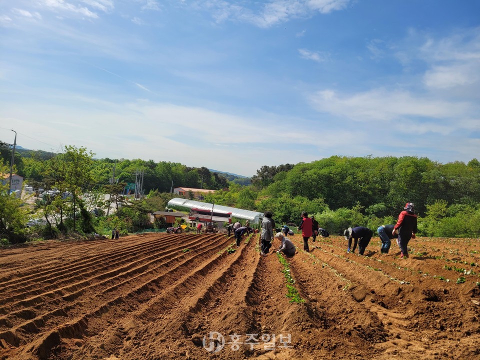 홍성군 품목농업인연구연합회는 지난 9일, 12일 홍성읍 고암리에 위치한 공동과제 학습포장 약 밭에서 고구마 시험 재배를 시작했다.<사진>