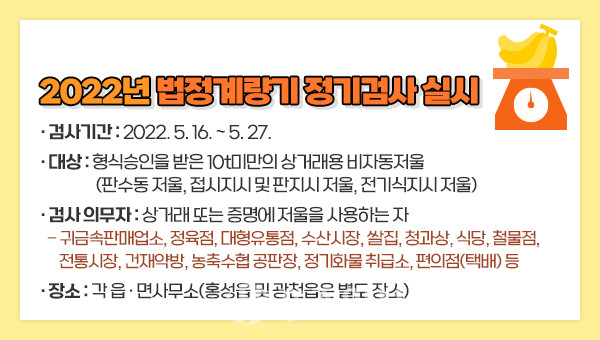 2년마다 실시하는 법정 계량기 정기 검사는 시장, 상가, 점포 등에서 상거래 시 사용하는 10톤 미만의 판수동 저울, 접시 지시와 판지시 저울, 전기식 지시 저울 등을 대상으로 하며 검사는 읍·면별 순회검사로 진행한다.
