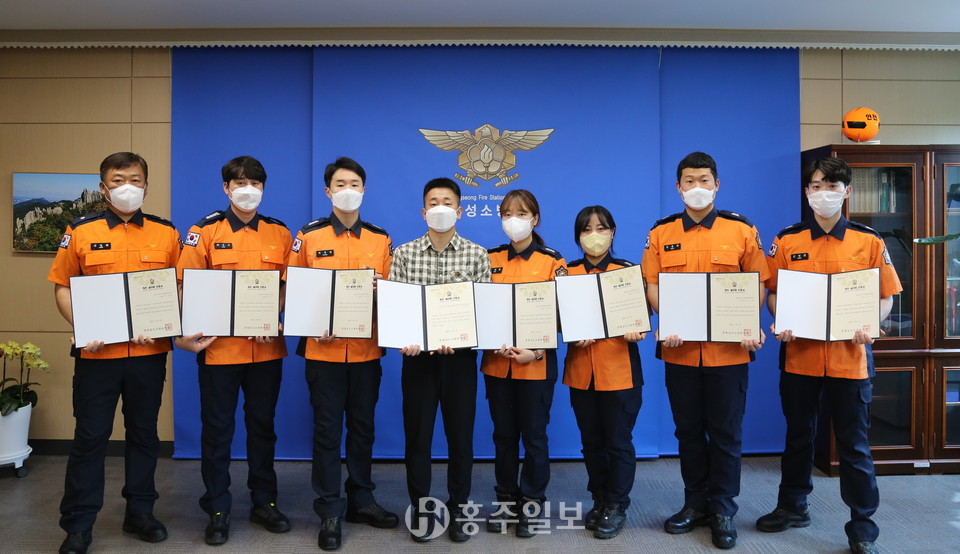홍성소방서(서장 김성찬)는 지난 12일 급성심정지 환자에게 신속한 심폐소생술과 전문응급처치를 시행한 군민과 신일환 소방위를 비롯한 구급대원 8명에게 ‘하트세이버’를 수여했다.<사진>