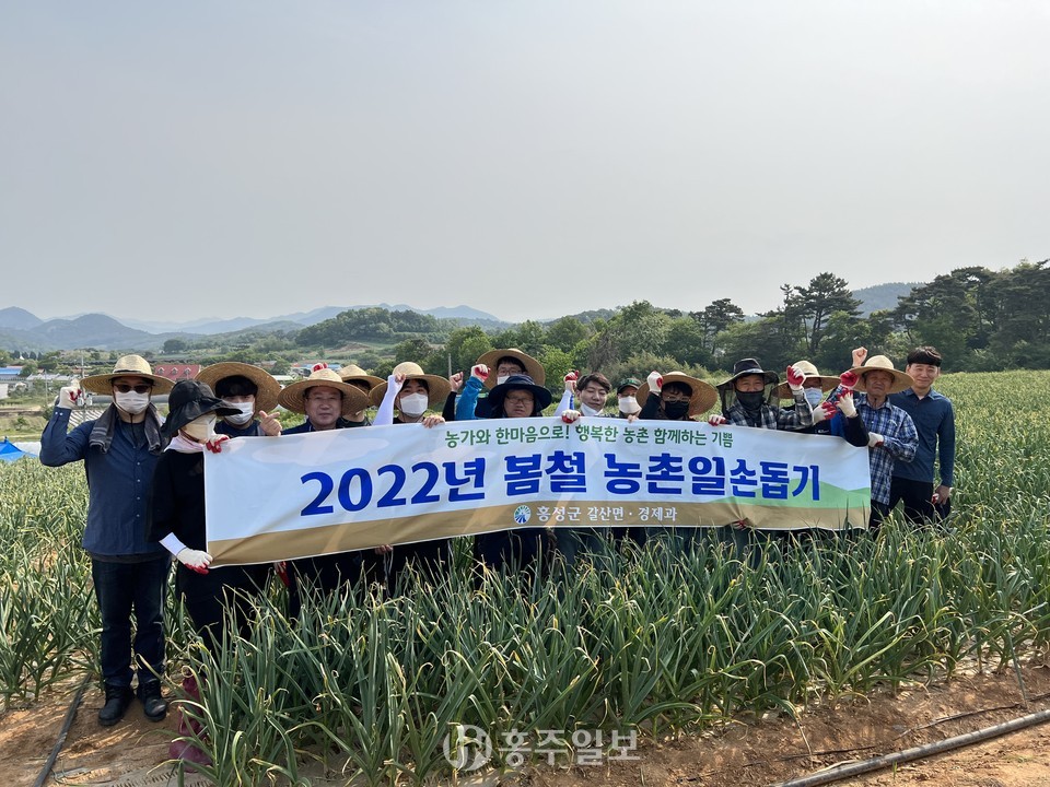이에 갈산면과 홍성군 경제과 30여 명은 인력난을 겪고 있는 농가를 돕기 위해 나섰다.