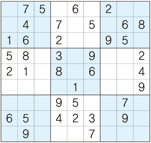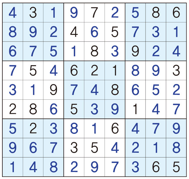 3. 큰 정사각형(9x9) 안에 있는 작은 정사각형(3x3) 안에는 숫자 1~9가 각 한 번씩 들어간다.