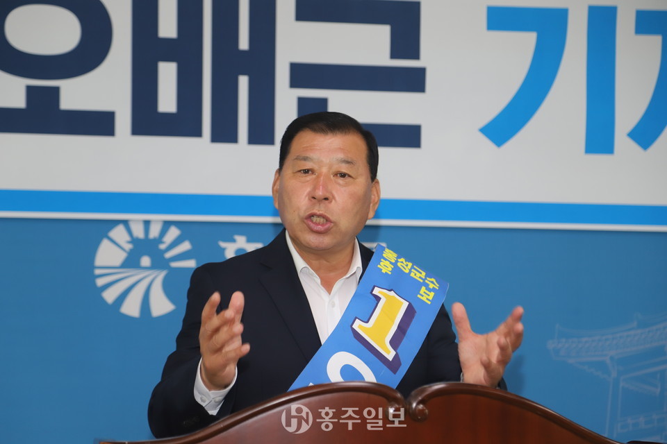 더불어민주당 오배근 홍성군수 후보는 24일 홍성군행정홍보지원실에서 기자회견을 개최해 “군수에 당선된다면 올해 사조 농장 축사를 이전하겠다”고 강조했다.