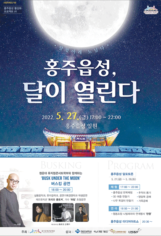 특히 가수 ‘하림’의 초청공연과 함께 청운대학교 뮤지컬 콘서트 학과의 버스킹 공연, 재즈뮤지션 ‘트리오 클로저’의 버스킹 공연이 오후 6시부터 8시까지 실시될 예정이다. 또한 홍주읍성 미디어 아트쇼, 홍주읍성 달 포토존, 홍성군 문화특화사업단 체험행사, 협동조합 나빌레라 연계 행사 연극 ‘만향’ 등 풍성한 볼거리들이 마련됐다.