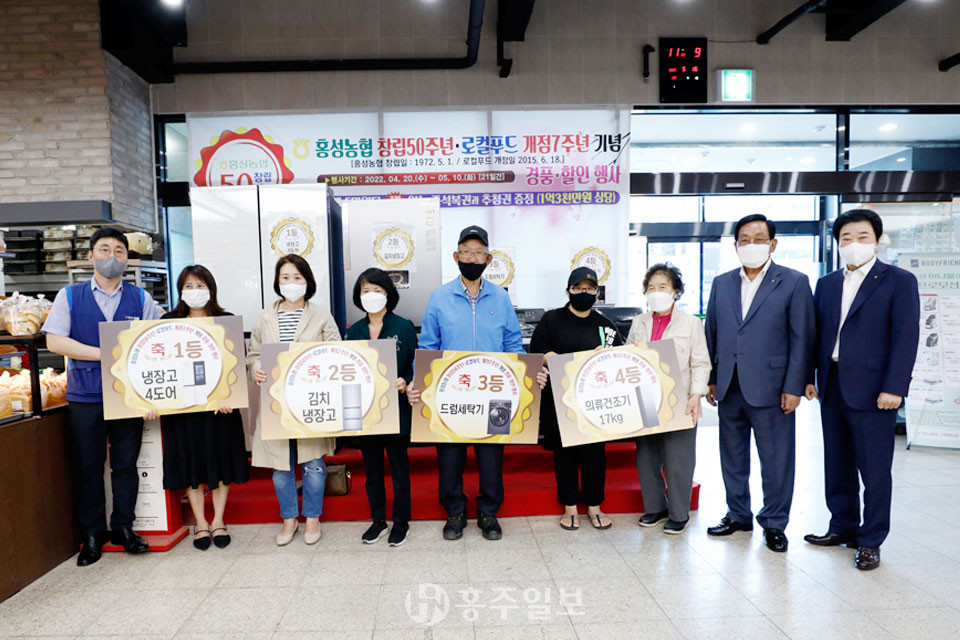 홍성농협 하나로마트는 ‘홍성농협 창립 50주년 기념 경품이벤트’를 실시해 지난 4월 20일부터 5월 10일까지 총 21일간 경품추첨 응모를 받았으며, 지난 21일 하나로마트 2층 회의실에서 공정함을 위해 대외기관 입회하에 냉장고, 김치냉장고, 드럼세탁기, 의류건조기 등의 주인공를 가리는 추첨행사를 실시했다.