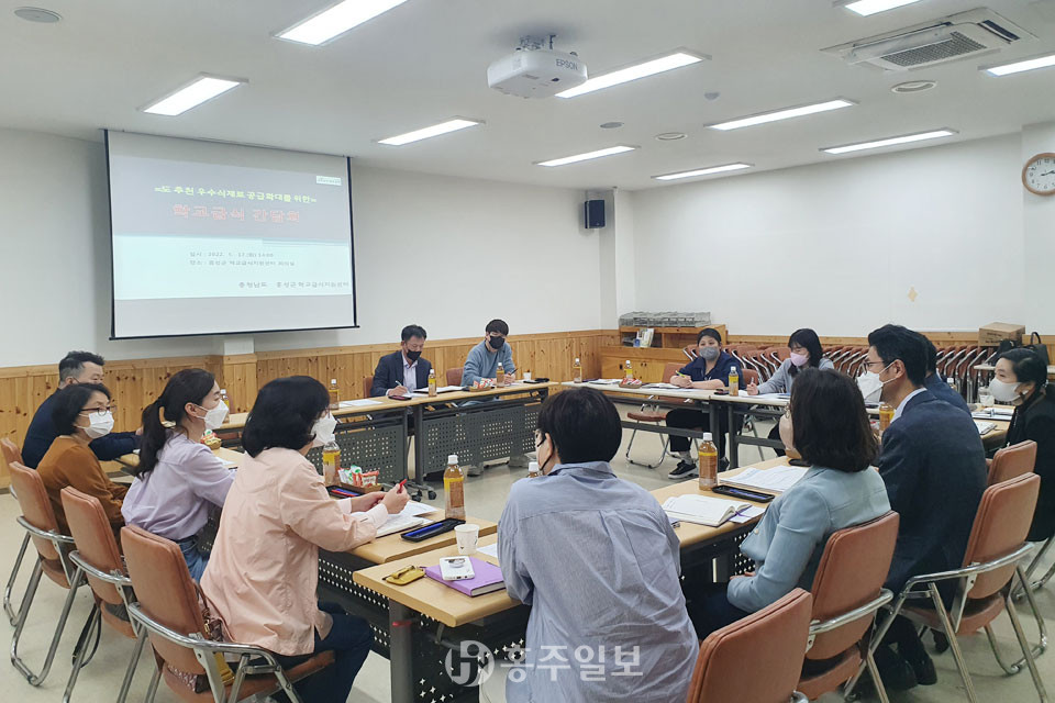 지난 17일 홍성군 학교급식지원센터에서 학교급식에 지역산 식재료 공급과 사용을 확대하기 위한 간담회가 열렸다.<사진>