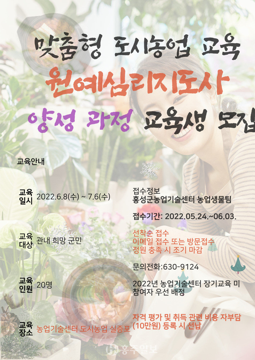 홍성군농업기술센터(소장 이승복)은 2022년 맞춤형 도시농업 교육으로 ‘원예심리지도사 양성 과정’ 참여자를 다음달 3일까지 모집한다.